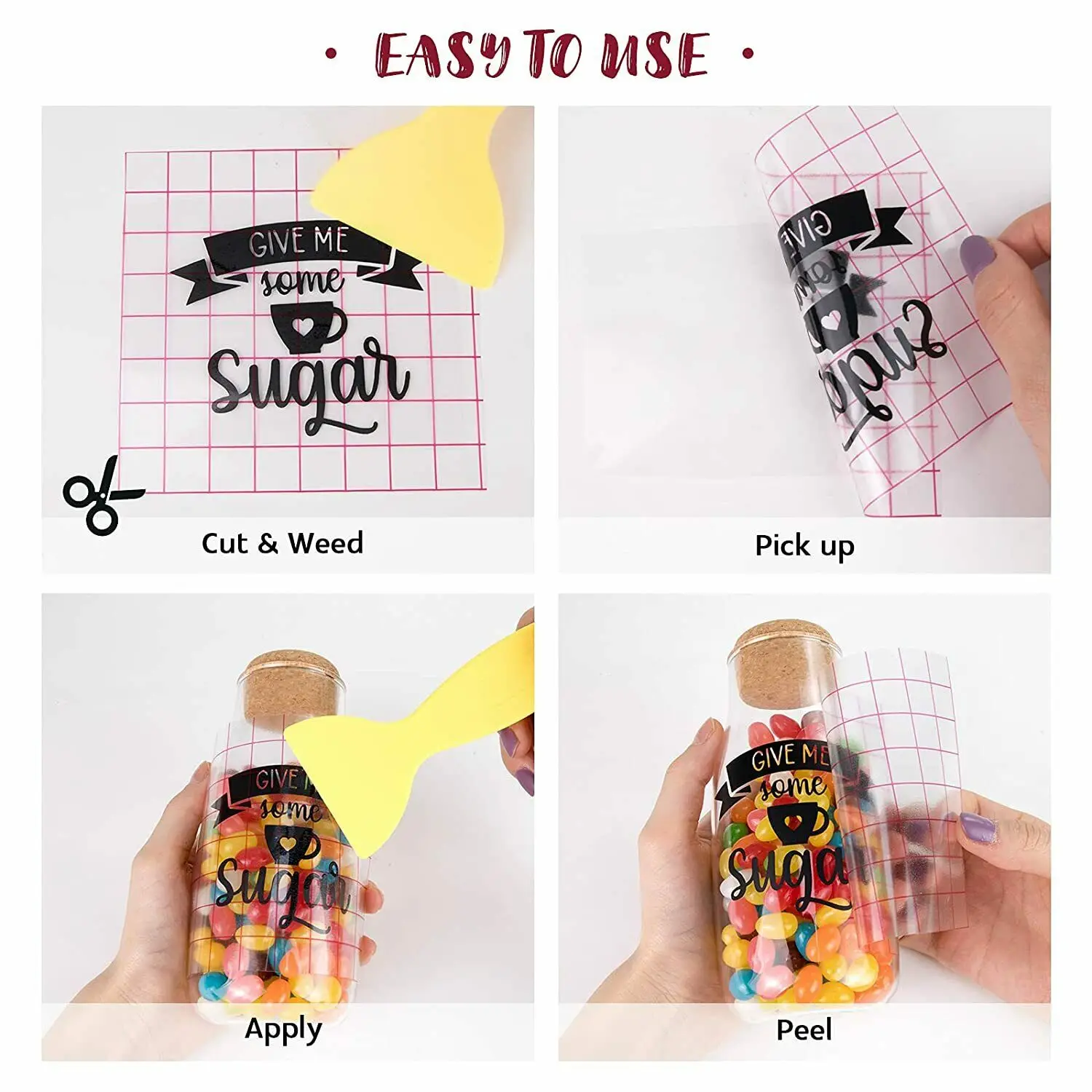Das rote Raster hilft dir dabei, deine Motive gerade und exakt zu positionieren – egal ob auf Tassen, Gläsern, Wänden, Möbeln oder Autos. Die transparente Folie haftet stark genug, um dein Design sicher zu übertragen, lässt sich aber rückstandslos wieder entfernen.
